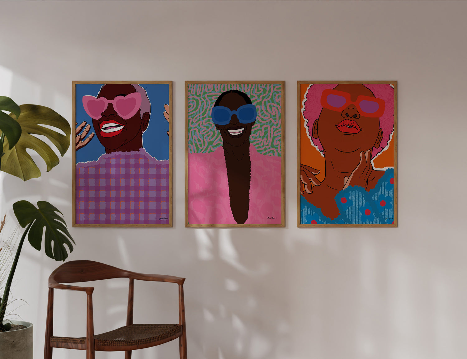 Set of three art prints featuring vibrant illustrations of three Black women.